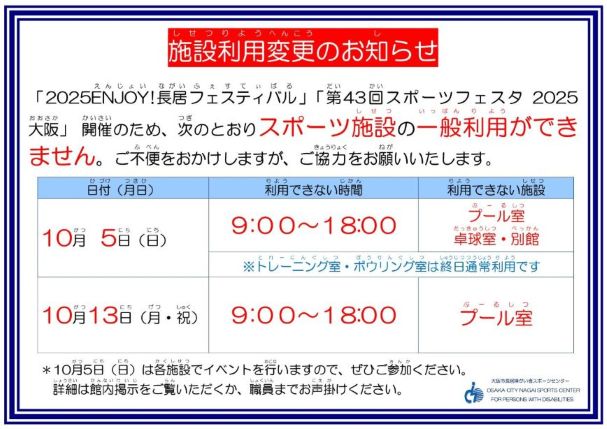 施設利用変更(一部施設の一般利用休止)について【10/5、10/13】