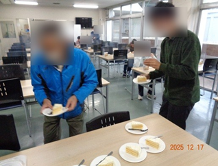 毎年恒例のクリスマスケーキとみかんの寄付を、12月17日(水)に佐竹食品株式会社さまよりいただきました。一足早いクリスマスケーキとなりましたが、生菓子のため当日出席されていた方たちに配布させていただきました。 皆さん「とてもおいしかった」と満足された感想が多かったです。