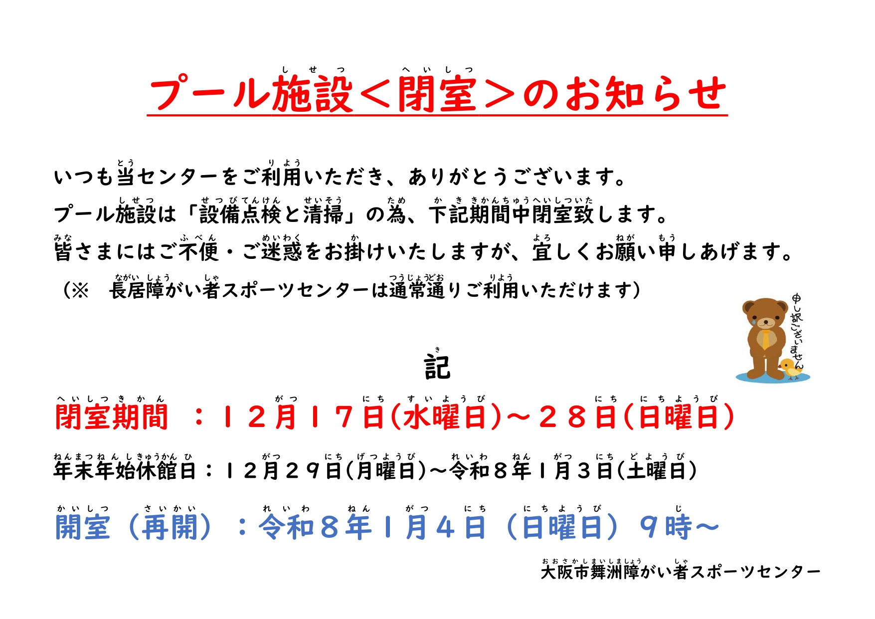 プール施設閉室について【令和7年12月17日(水)~12月28日(日)】